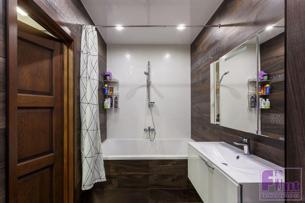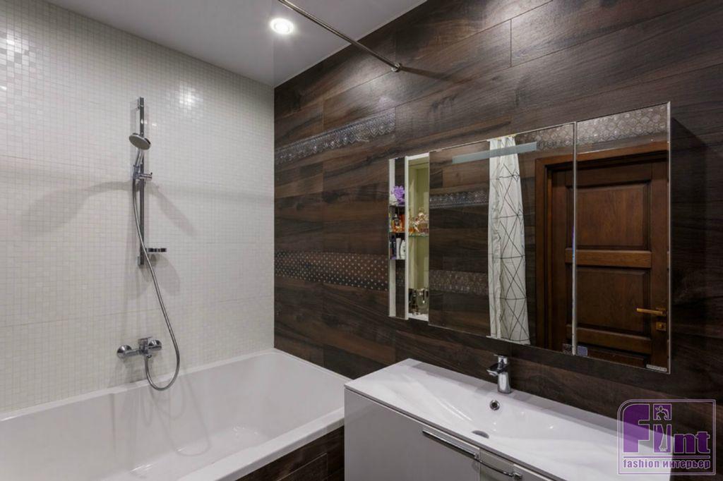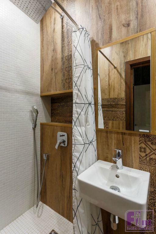 «Лофтовая» тема продолжает в санузле и частично на кухне. В гостиной же по эскизам дизайнера выполнили потолок с подсветкой, узор которого отсылает к Востоку. Одна из сложностей, возникших при реализации проекта, была связан с расположением окон на балконе: из-за их высоты не удалось декорировать потолок в том же восточном стиле, как и в гостиной. Ещё с одной проблемой Елене пришлось столкнуться при проектировании дизайна зоны кухни. «Система вытяжки была укороченная, а вентиляция сложная, из-за чего невозможно было подключиться напрямую, — рассказывает Елена. — И хозяин нашел решение, для вытяжки погнули лист металла и тонировали».