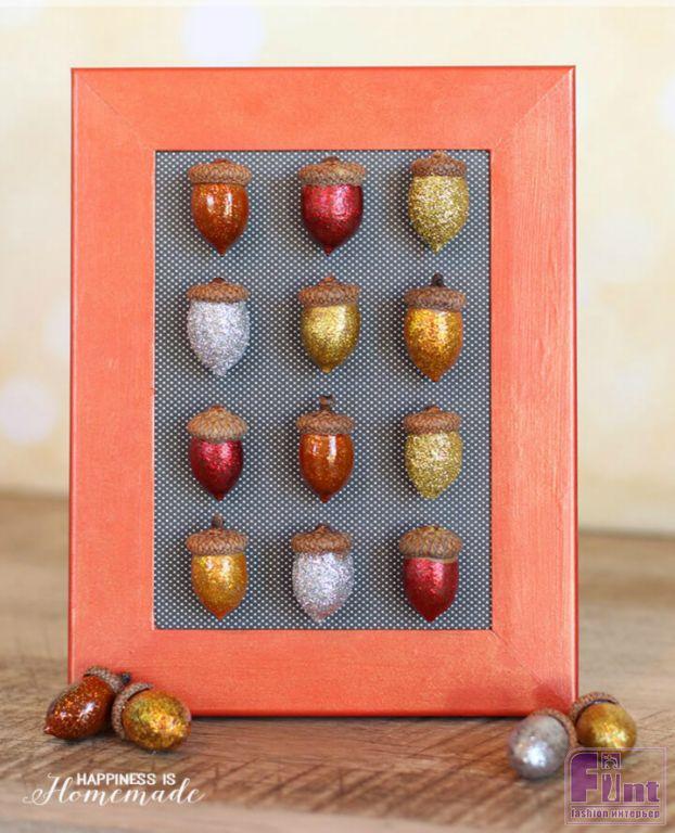 Осталось поместить нашу основу с наклеенными желудями в фоторамку, из которой предварительно следует удалить стекло. Наше настенное панно в осеннем стиле из желудей готово! Его можно повесить на стену, или просто установить на рабочий стол. Выглядит просто восхитительно, и изготавливается невероятно легко!