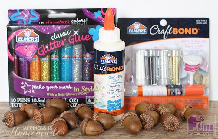 Обычно, в детских наборах для творчества предлагают 4 основных цвета блёсток. Но лучше, если вы сможете найти в магазине набор с шестью и более цветами, среди которых обязательно должен быть серебряный и золотой. Так каждый из наших жёлудей будет единственным и неповторимым на панно! Если же у Вас мало цветов блёсток – не беда! Просто расположите жёлуди так, чтобы одинаковые цвета не сильно группировались на панно.