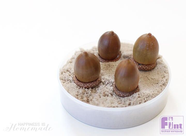 Для начала собранные в парке или в лесу жёлуди следует хорошо высушить. Для этого вполне сгодится небольшое блюдце с мелким песком. Песок отлично удерживает жёлуди в вертикальном положении и впитывает лишнюю влагу. Важно, чтобы наши жёлуди высыхали самостоятельно. Не стоит их нагревать или класть на батарею – так они могут сморщиться и потерять форму.