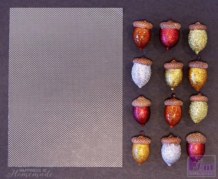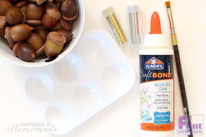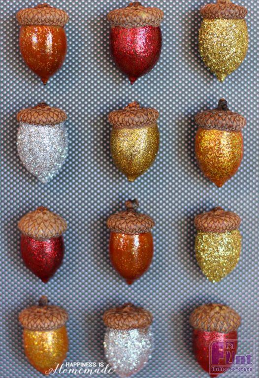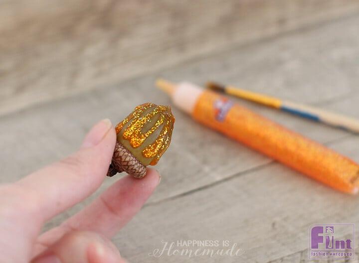 После того, как жёлуди подсохнут в течение нескольких дней, их можно начинать декорировать. Для раскрашивания желудей можно просто использовать клей с блёстками. Его нужно нанести на желуди, исключая попадание на «шляпку» и равномерно распределить.