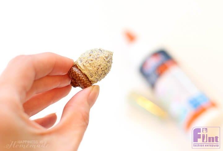 Тщательно перемешайте клей и блёстки до получения однородной массы и нанесите её на жёлуди с помощью кисточки равномерным слоем. Высыхать раскрашенные жёлуди можно поставить в тот же песок, в котором они сохли до декорирования.