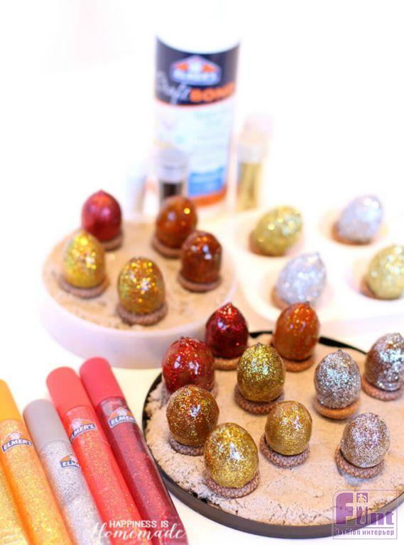 Чтобы жёлуди стали более объёмными и выразительными, их можно повторно покрыть вторым слоем смеси клея и блёсток. Не забывайте промывать кисточку после каждого нового цвета блёсток, чтобы у нас получились разноцветные блестящие жёлуди с чистыми и яркими цветами.
