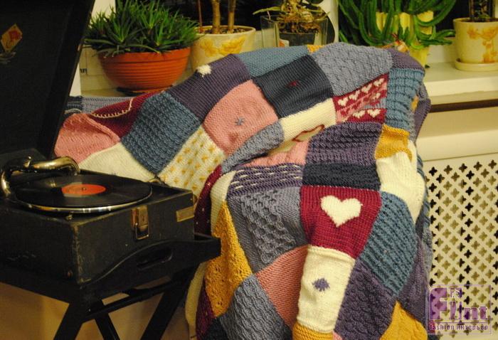 Набранные из разноцветных квадратов пледы пригодятся на даче, в загородном доме. Связанное таким образом покрывало или плед станут ярким акцентом в монохромном интерьере. Грубые жёсткие шершавые поверхности кирпича и бетона выгодно подчёркивают мягкость и объёмность вязаного пледа.