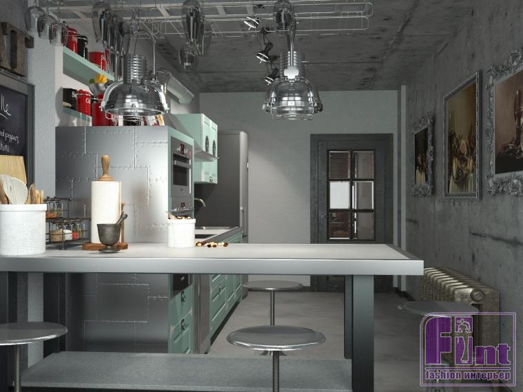 Кухня в проекте оснащена по последнему слову техники. Металл в матовом хромированном цвете отлично сочетается с фасадами кухонного гарнитура, окрашенными в благородный мятный цвет. На кухне дизайнер применила интересное световое решение. Зона приготовления пищи подсвечена несколькими видами светильников, а над барной стойкой подвешены потолочные лампы индустриального вида.