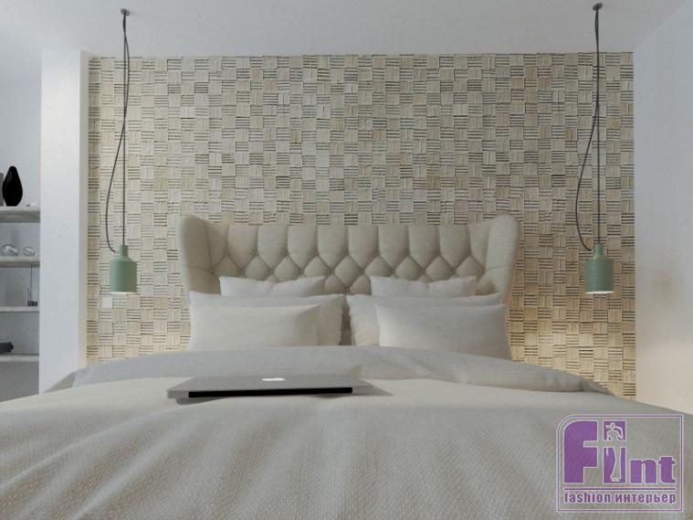 Спальню и гостиную отделяет прозрачная перегородка, которую можно легко сделать непрозрачной, благодаря установленным жалюзи и плотным портьерам. Спальня решена в светлых тонах с акцентной кирпичной стеной – как дань стилю лофт. Стена над изголовьем кровати отделана фактурными 3D панелями с имитацией бамбуковой циновки.