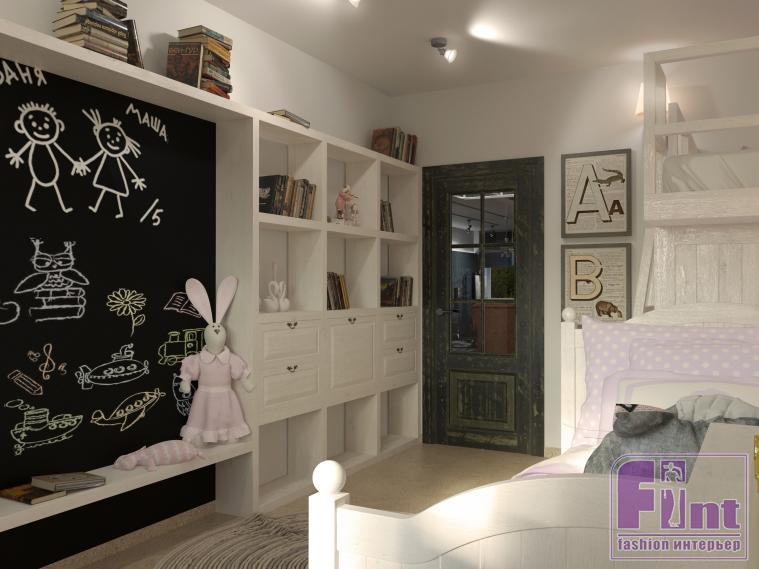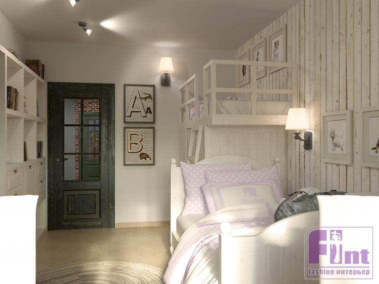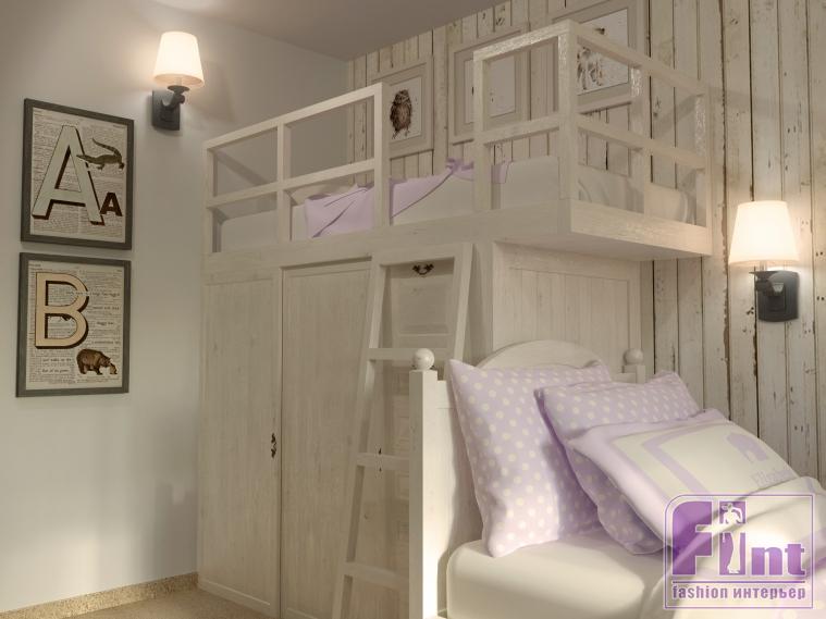 В целом, детская комната немного выбивается из основного стиля лофт и, скорее, тяготит к провансу и щебби-шику. Об этом красноречиво говорят покрытые чехлами стулья с бантами-подвязками, белая мебель и акцентная стена, обшитая искусственно состаренными деревянными панелями.