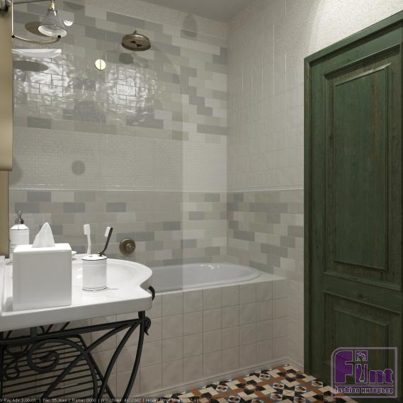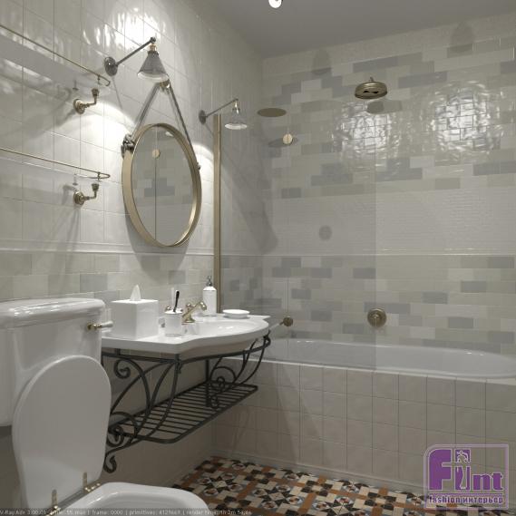 В ванной комнате дизайнер предложила использовать много металлических деталей и элементов интерьера. Это и настенные медные светильники, и кованные полочки с подстольем для раковины, и рейлинги и даже круглое зеркало в металлической раме, подвешенное на фактурный канат.