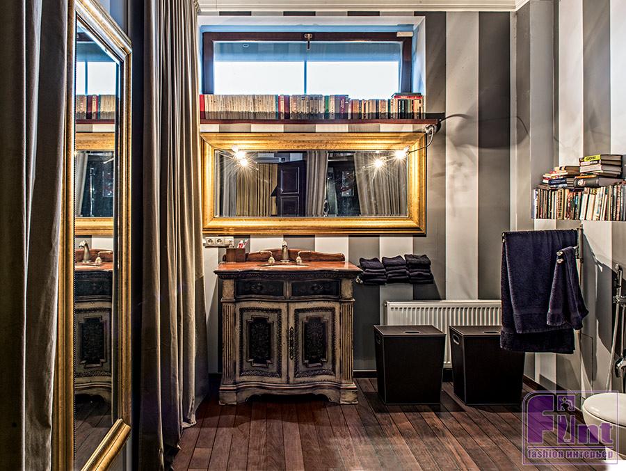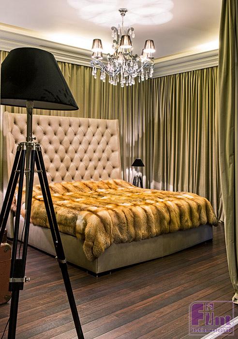 Р.М. | Да, третий этаж отдан в распоряжение сыновей — Степана и Никиты. Второй этаж занимают кабинет, спальня, гардеробная и ванная. Все эти помещения полностью задрапированы бархатными плотными портьерами. Получается такой эффект шкатулки: можно спать вне зависимости от времени суток — окна закрыты всегда. Даже в санузле, который больше похож на комнату — с окном, крашеными стенами, зеркалом в тяжёлой позолоченной раме, расписанным вручную туалетным шкафчиком, бархатные гардины красиво закрывают ванну... И, если вы заметили, в доме нет часов. Это потому, что всю суету надо оставлять за порогом, тут время должно останавливаться.