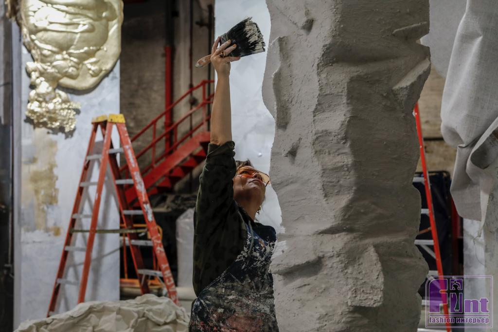 Бруклинский дизайнер Иоланда Батто из бюро Callidus Guild создала инсталляцию из серии колонн, отделанных штукатуркой и инкрустированных металлом и камнем, а галерея Jeff Lincoln Art + Design предоставила для неё мебель и керамику.