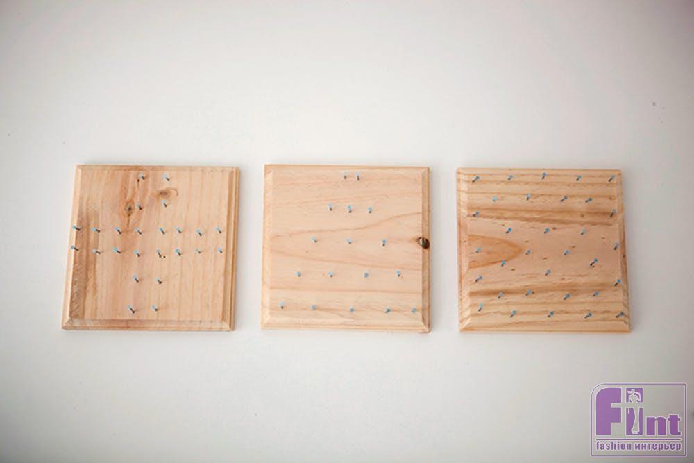 Для начала необходимо разметить на дощечках будущий узор и отметить, куда мы будем вбивать маленькие гвоздики. После разметки забейте гвозди в доску, стараясь вбивать их на одинаковую высоту. В этом нам может помочь обычная полоска из бумаги, которую нужно обернуть вокруг гвоздика и вбивать его, пока полоска не упрётся в шляпку. Также убедитесь, что ваши гвоздики вбиты крепко и не торчат с обратной стороны дощечки.