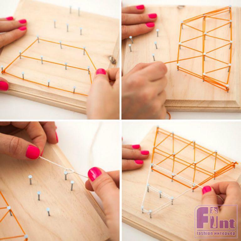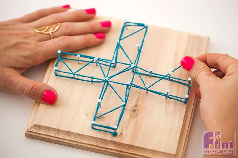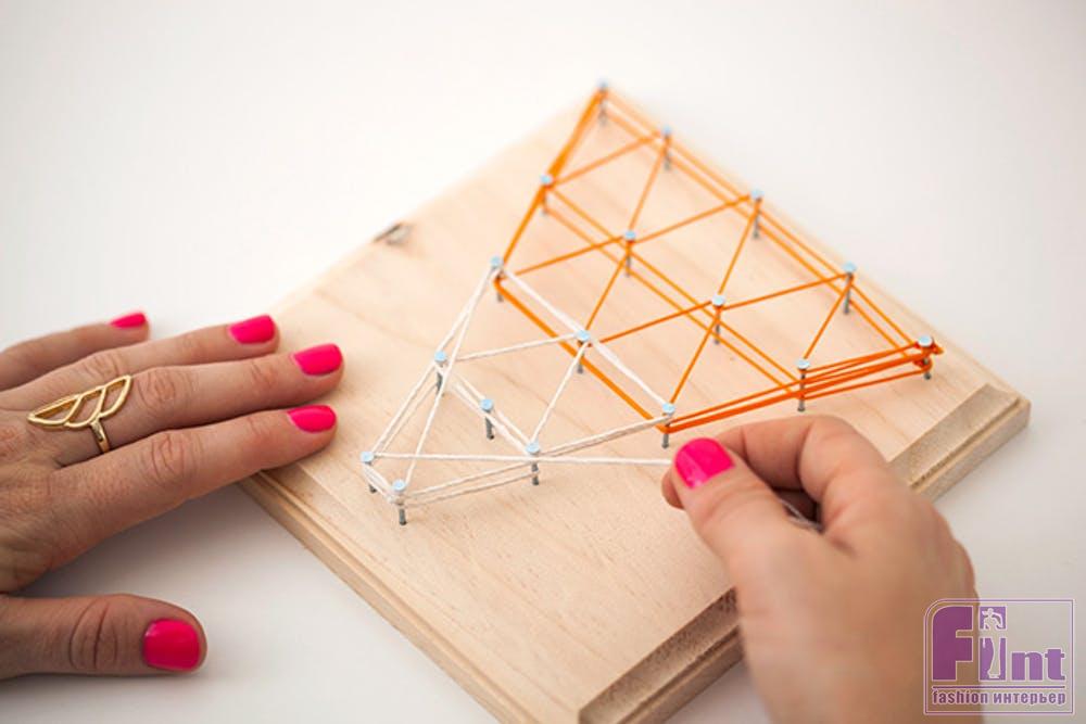 Теперь можно приступать к украшению панно в технике string art. Начиная с угла, привяжите нитку к крайнему гвоздику и начните оборачивать гвозди по порядку, следуя выбранному узору. Как только вы закончите «плетение» вокруг гвоздиков, привяжите нитку к последнему гвоздику и отрежьте излишки нити. Мы решили сделать три панно в одинаковом стиле, для чего выбрали три различных орнамента: крест или знак «плюс», стилизованный двухцветный треугольник и запутанный «лабиринт». При плетении узора не забывайте, что в нём будут «жить» наши растения, поэтому оплетайте места их установки с особой тщательностью.