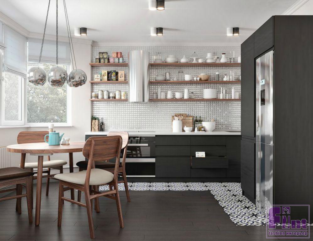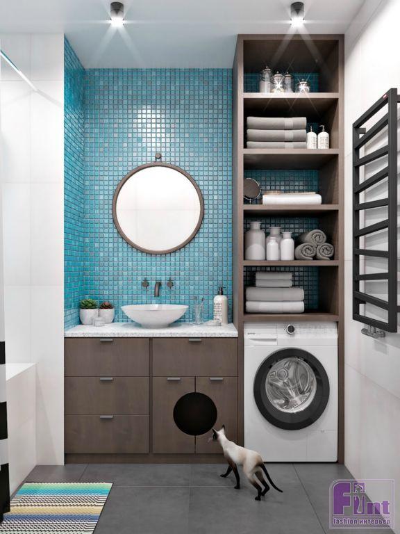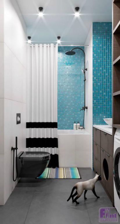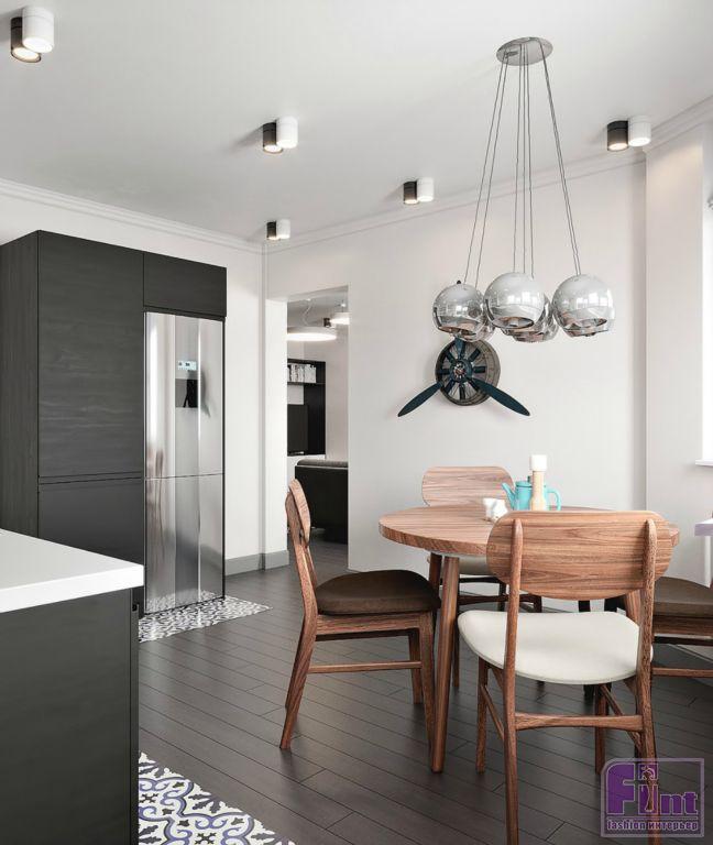 В основу стилевого решения всего проекта был положен лаконичный скандинавский минимализм. Монохромное пространство общей зоны построено на контрасте чёрного и белого, с вкраплениями оттенка дерева, баклажанного и серебристого. В спальне основное сочетание — глубокая морская волна, шоколадный и молочный оттенки. Наполнение интерьера спальни весьма лаконично: кровать и прикроватные тумбы, комод под ТВ и небольшое количество настенного декора. «И в интерьере санузла не обошлось без контрастов — фоновый однотонный керамогранит молочного оттенка отлично сочетается с мелкоформатной мозаикой насыщенного цвета морской волны и элементами чёрного цвета», — отмечает дизайнер.