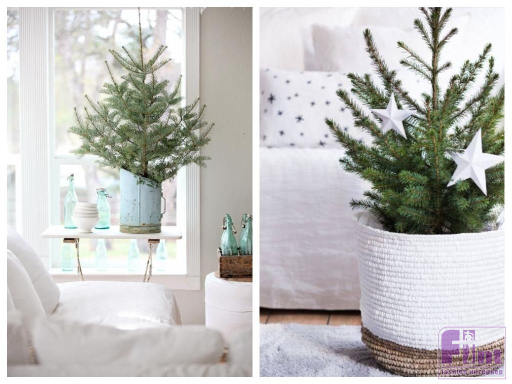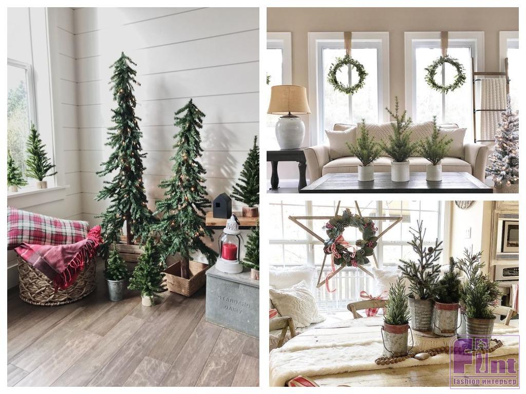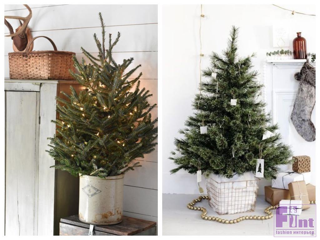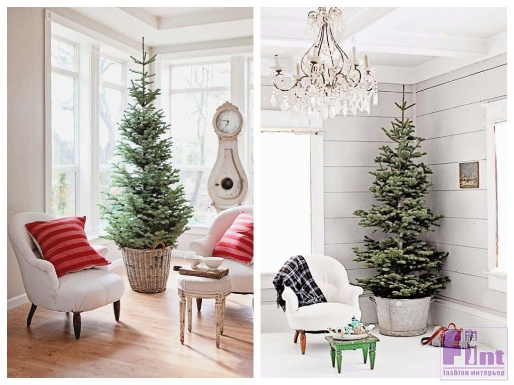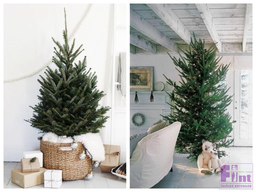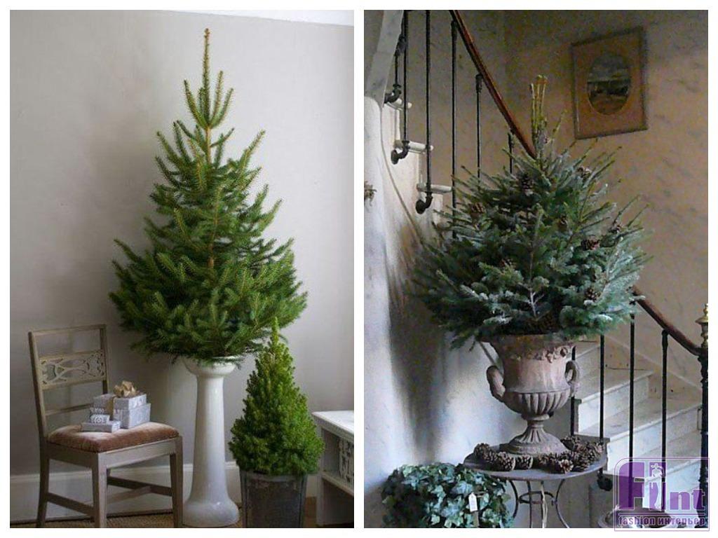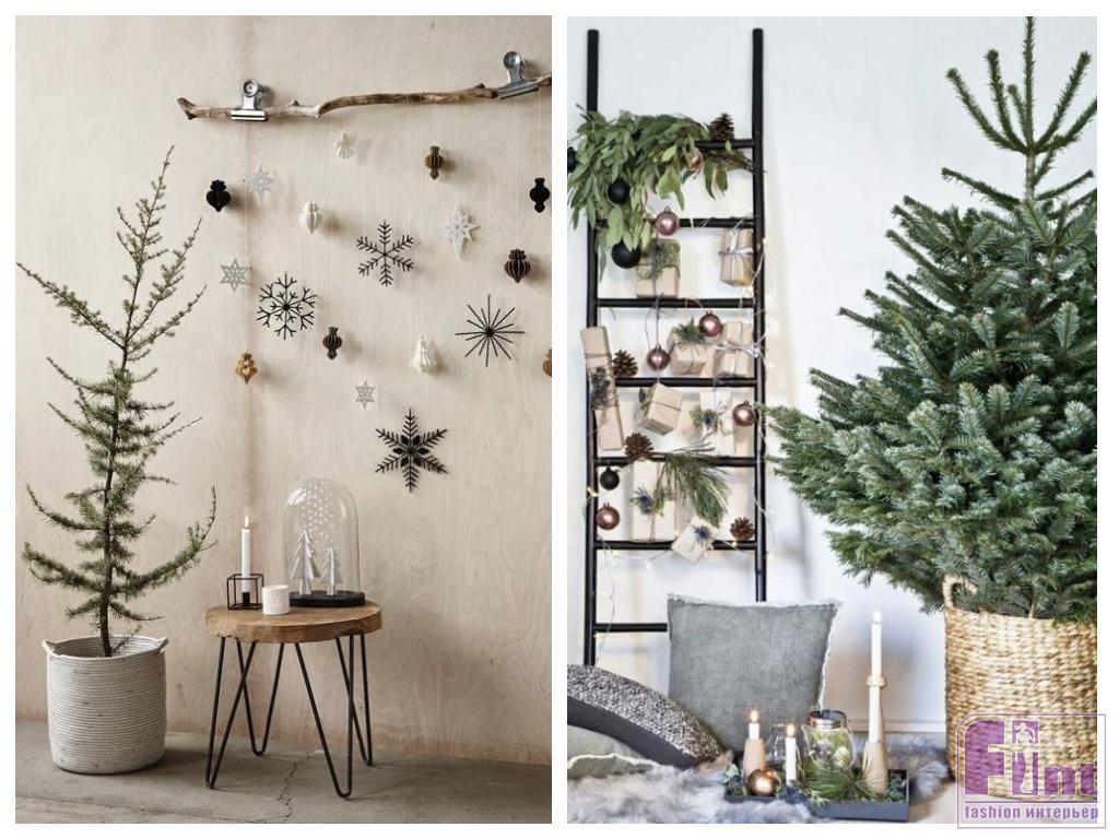 Праздничное дерево «без излишеств» придётся кстати, например, на кухне или в спальне. А в гостиной, если что, можно поставить и привычную нарядную ёлку. Те, кому всё же хочется чего-то традиционно-новогоднего «для настроения», вешают на ветки дерева несколько небольших украшений в единой цветовой гамме или скромную одноцветную электрическую гирлянду.