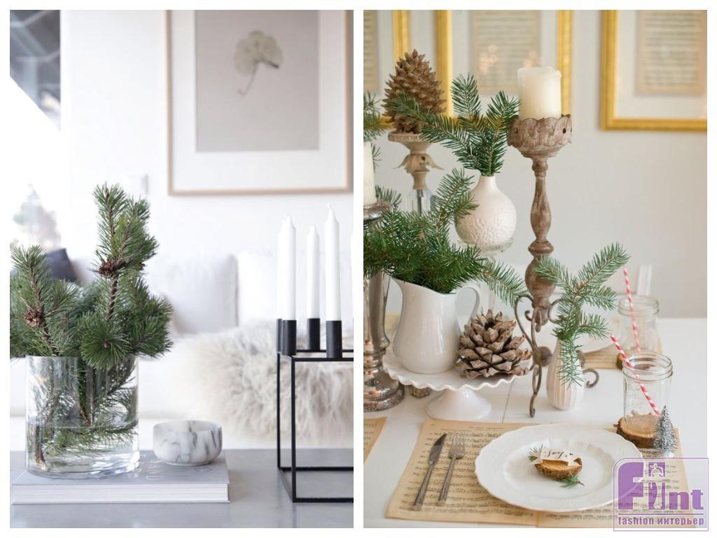 Хвойный аромат создаёт праздничное настроение, зелень оживляет даже самый аскетичный интерьер — нужно ли расцвечивать мишурой то, что и так гармонично? Конечно, вкусы у всех разные, и нет тут какого-то единого эталона. Но отчего бы не попробовать создать простую и элегантную композицию: только хвойная веточка в прозрачной ёмкости и свечи... А если вам повезло: на ветках оказались шишки, — они-то и послужат украшением! Осталось лишь удачно расставить «букеты» в подходящих вазах.