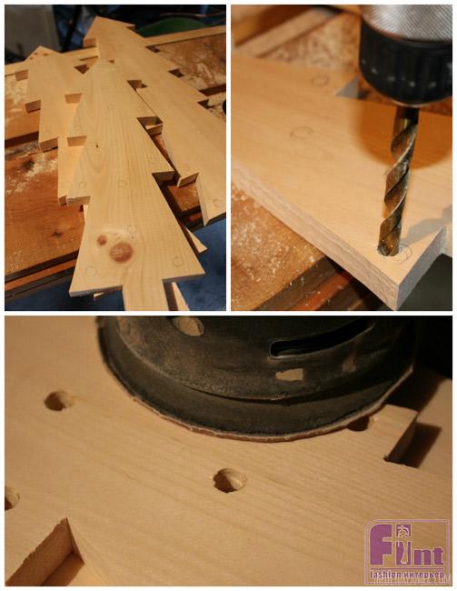 Шаг №3. С помощью электрической дрели просверливаем в заготовках отверстия, чтобы вставить в них лампочки. Старайтесь наметить места под отверстия в произвольном порядке, чтобы получилась красивая игра света. Диаметр отверстий должен позволять достаточно свободно вставить в них лампочки.