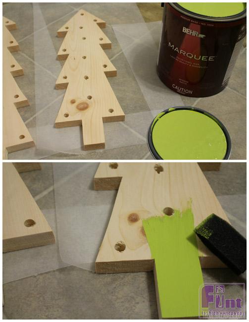 Шаг № 5. Приступаем к окрашиванию! Наш новогодний аксессуар будет установлен в квартире, поэтому мы используем интерьерную краску для внутренних работ. Если же вы планируете установить ёлочки снаружи дома – выбирайте краску для наружных работ. Для окрашивания достаточно одного слоя, хотя, если вас захватило творчество, можете покрыть изделия двойным слоем, дождавшись высыхания первого слоя.