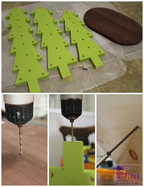 Шаг № 7. Прикрепляем деревья к основанию. Определите, где на основании будут установлены ёлочки, и просверлите в основании и деревьях отверстия подходящего диаметра. Прикрутите ёлочки к основанию при помощи длинных шурупов.