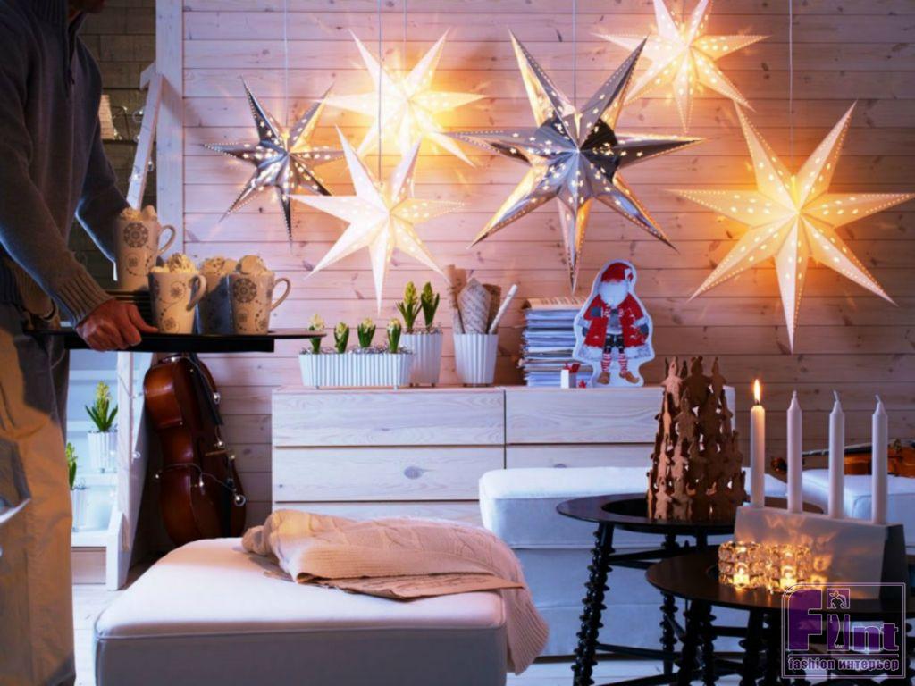 Не забывайте о таких простых и очевидных возможностях, как: новогодние композиции со свечами – их легко установить в любой комнате; объемных снежинках из бумаги, которые можно подвесить на окна или даже на люстры; словах и формах, сложенных из гирлянд с фонариками. И тогда Ваш дом волшебным образом преобразится к новогодним праздникам, даже если в нём не будет ёлки!