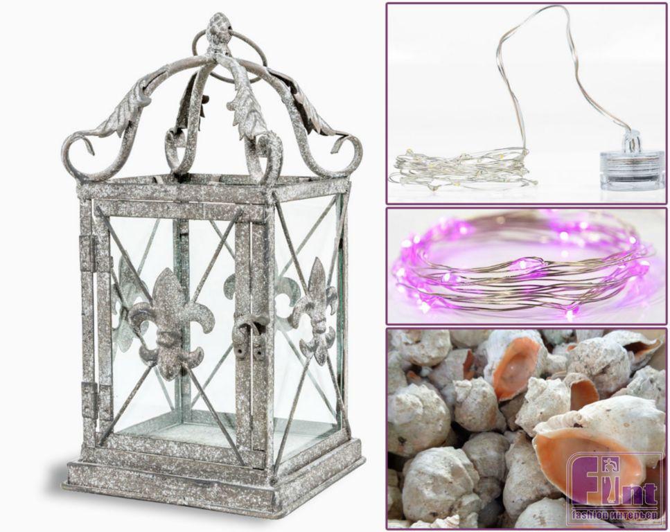 Для изготовления интерьерного светильника из фонаря-подсвечника нам потребуется, конечно же, сам фонарь-подсвечник. Также нам необходимо подобрать несколько подходящих морских ракушек среднего размера (5-6 шт.) и приобрести современную ёлочную гирлянду, работающую автономно от батареек, без подключения к электрической сети.
