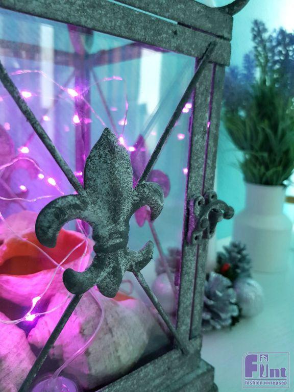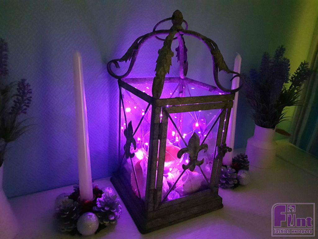 Для нашего проекта мы выбрали 2-метровую гирлянду, которая светится одним цветом – сиренево-розовым. Светящихся элементов в ней не очень много – всего 20 шт., но для нашего проекта это именно то количество, которое является оптимальным. Сиренево-розовый оттенок светодиодов лучше всего подошёл в качестве цвета-компонента для нашего интерьера. Вы же можете подобрать цвет гирлянды под цветовую гамму вашего жилого пространства. Наша гирлянда светодиодная и состоит из очень тонких, почти невидимых проводков, которые «держат» форму. То есть, их можно сгибать и укладывать так, как вам этого захочется. Для проекта это очень важно, поскольку нам нужно заполнить светящимися точками всё оставшееся пространство фонаря-подсвечника.