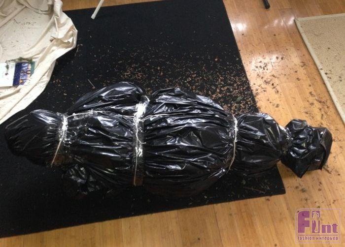 - Из-за того, что ёлка может запросто проткнуть полиэтиленовый пакет, некоторые предлагают использовать для выноса высохшей новогодней ёлочки старую простыню или подходящую по размеру ткань, например, старые шторы. Расстелите рядом с ёлкой большую старую простыню или другой кусок ткани и аккуратно перенесите на него ёлку. Заверните дерево, перевяжите получившуюся «мумию» верёвкой и смело выносите на улицу.