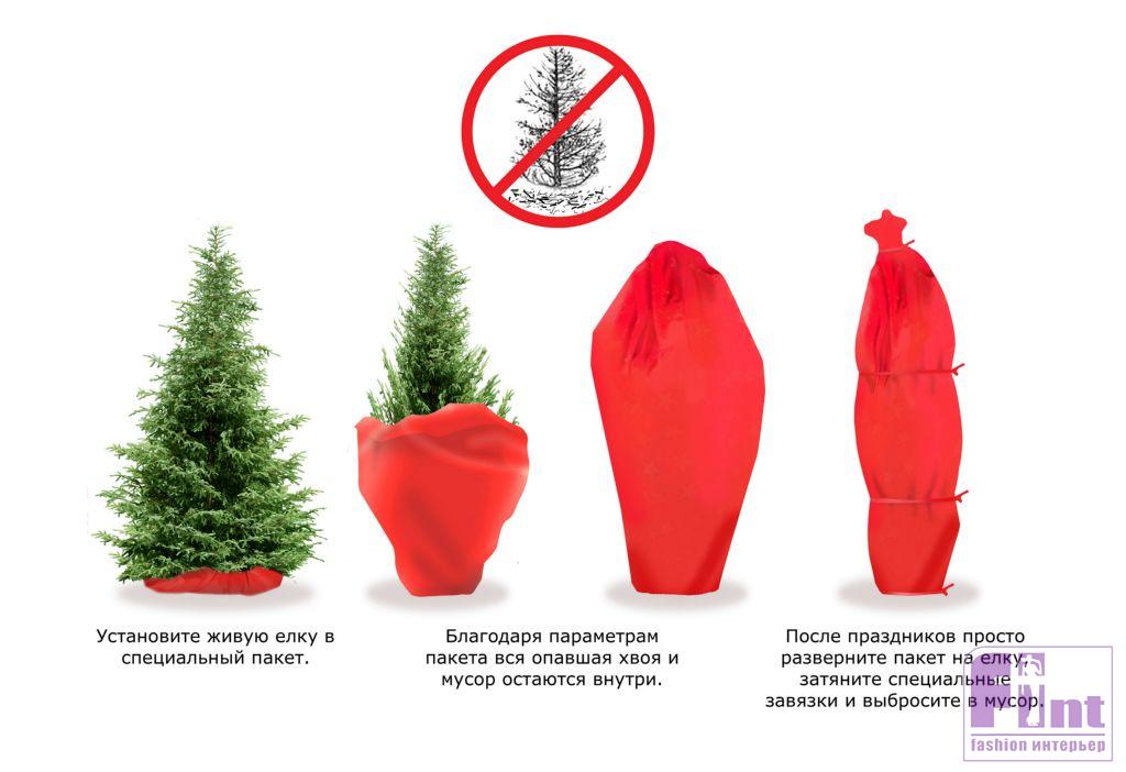 - Небольшое дерево можно завернуть в объёмные мешки с двух сторон — снизу и сверху, не обрезая ветки. Для этого понадобятся прочные полиэтиленовые пакеты, которые коммунальные службы используют для сбора осенних листьев. Стыки пакетов следует перемотать скотчем и в таком виде транспортировать дерево до мусорного бака. Если у вас есть большой мешок, в который ёлочка может войти полностью – это вообще идеально! Перед установкой ёлки просто положите пакет на пол, свернув его края. Чтобы пакет не нарушал новогоднюю красоту, его можно «закамуфлировать» мишурой. После праздников остаётся лишь развернуть пакет и перетянуть его скотчем или верёвками! Ни грязи, ни мусора, ни иголок на полу!