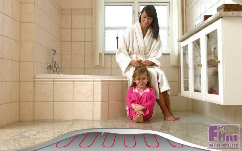 Монтаж проводов делают на этапе выравнивания пола, потому что кабель и датчик системы нужно уложить под бетонную стяжку. Продумайте размещение розетки и выключателя «теплого пола»: розетку лучше вынести в коридор, а выключатель разместить на стене как можно ниже, чтобы было удобно включить даже ребёнку.