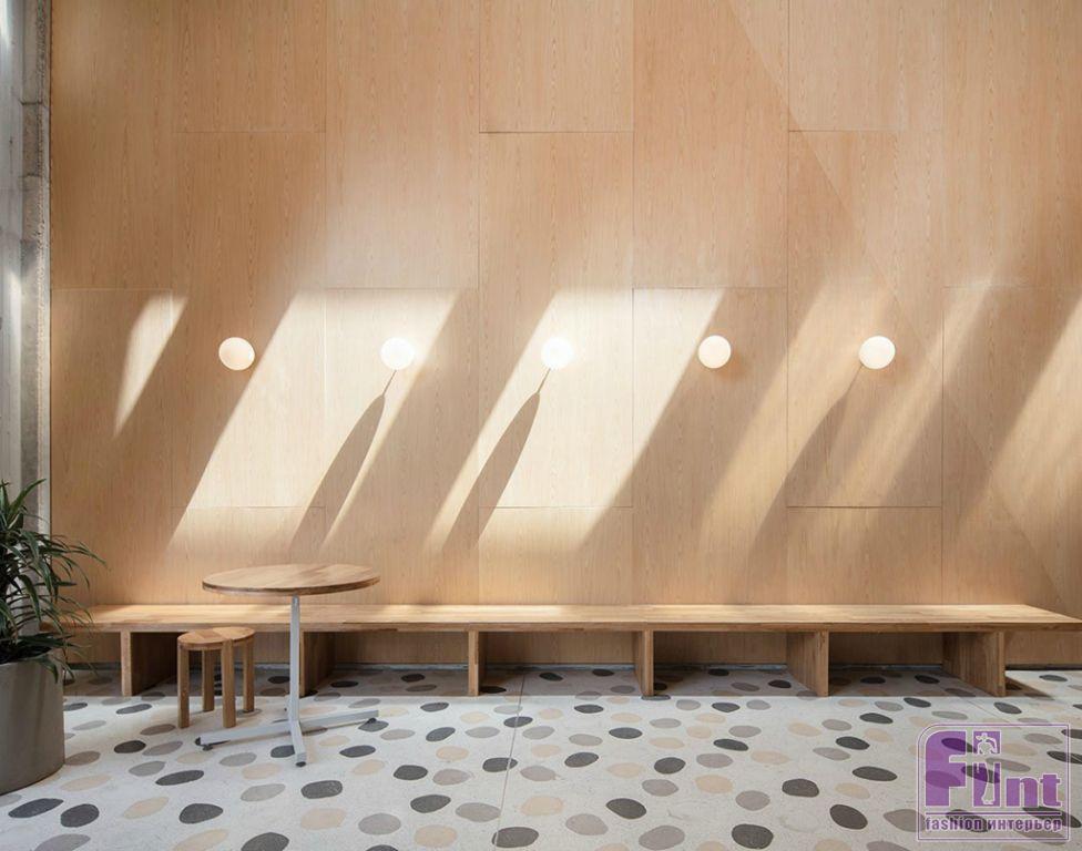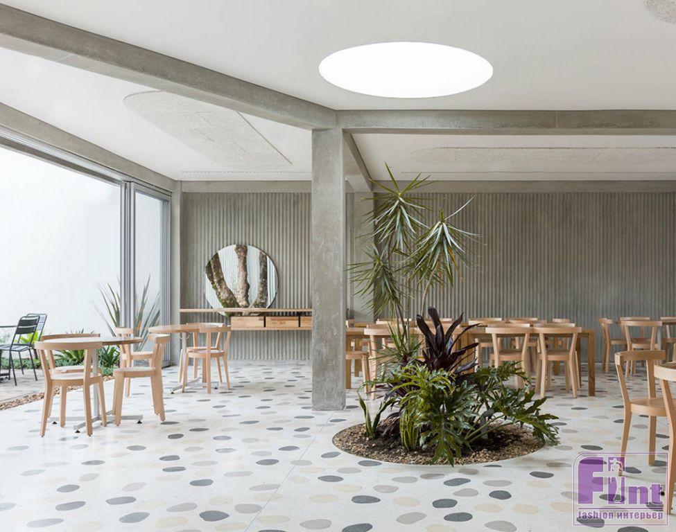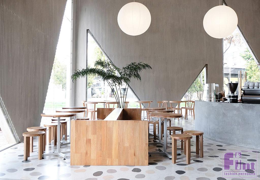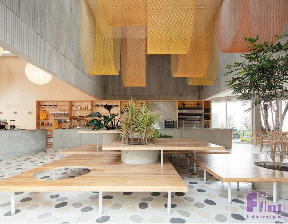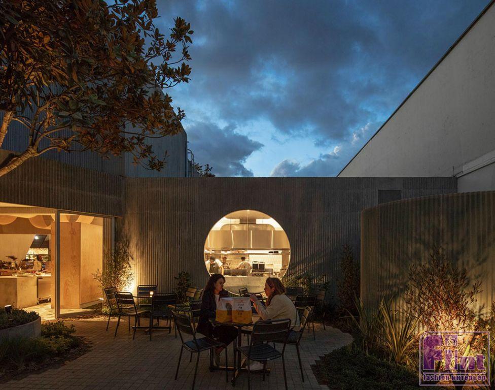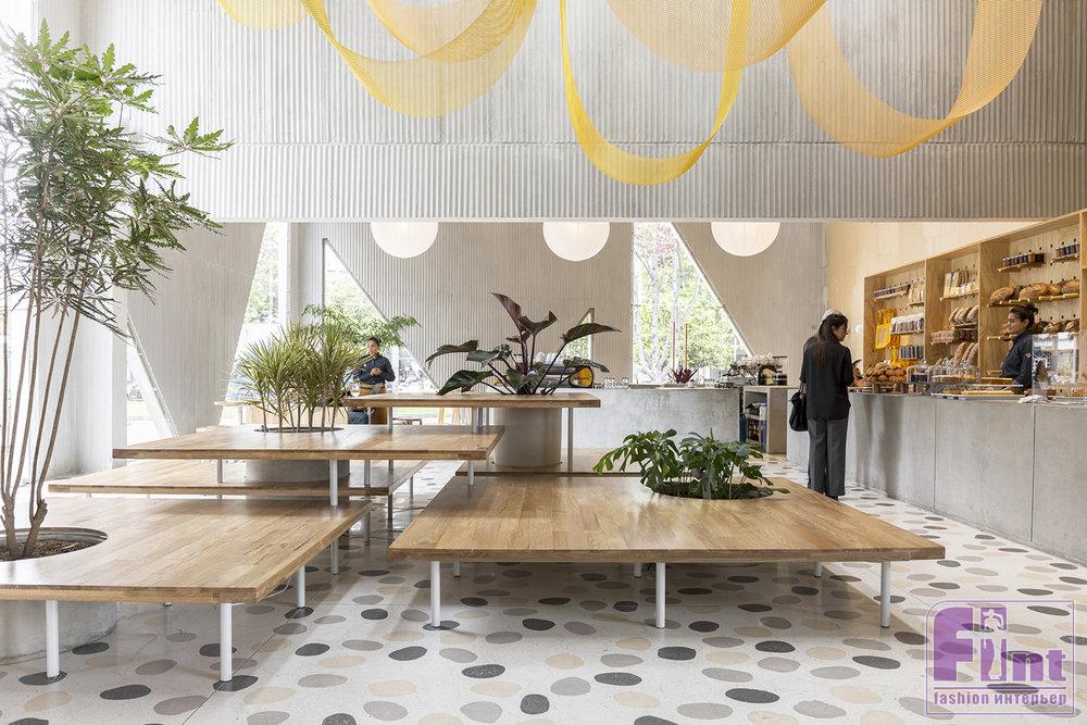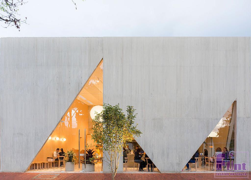 Снаружи постройка привлекает внимание за счёт контраста холодной, ровной поверхности фасадов с тёплой подсветкой интерьера, отделанного натуральным деревом. Внутри всё ещё интереснее и гораздо разнообразнее: острые углы треугольников-окон «уравновешены» бумажными светильниками-шарами, круглыми столиками, табуретами, зеркалами и потрясающим рисунком пола с терраццо в виде неровных округлых пятен. На террасу с извилистым контуром выходит большое круглое окно, а под брутальным бетонным потолком развешаны отрезы тонкой сетчатой ткани в желтых и терракотовых тонах.