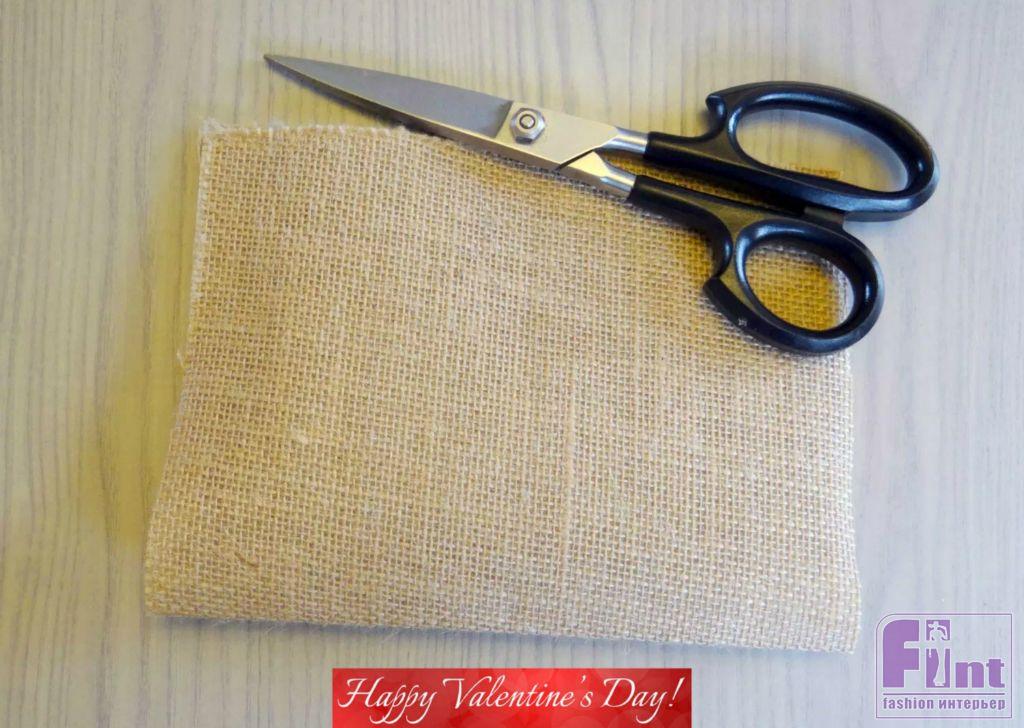 Для нашего проекта мы используем декоративную мешковину, купленную в магазине для рукоделия. На самом деле, можно использовать самую обычную мешковину. Главное, чтобы она была чистая и не сильно помятая. Разверните мешковину и отмерьте полотно по высоте закрывающее бутылку до горлышка – затем удвойте этот размер, чтобы в дальнейшем мы могли сложить мешковину вдвое. Длину этого куска можно определить просто, обернув мешковину вокруг бутылки. Нам необходимо, чтобы мешковина оборачивала бутылку с небольшим запасом. Сложите отрезок мешковины пополам и примерьте к бутылке. Если наш кусочек мешковины оборачивает бутылку, как и было задумано, откладываем мешковину и приступаем к простому декору бутылки.