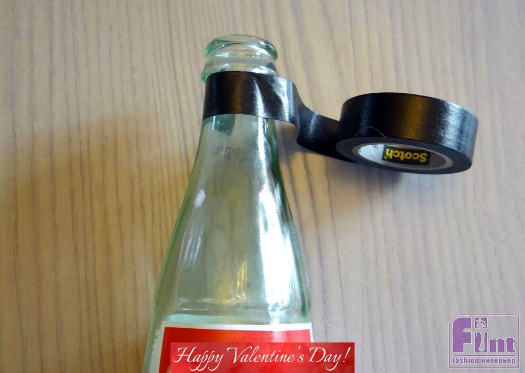 Декор бутылки будет у нас совсем простой. Для украшения бутылки просто оберните её горлышко скотчем или изоляционной лентой чёрного цвета. Сделайте несколько витков скотча, чтобы чёрная «полоска» на горлышке была шириной примерно в 2 см.