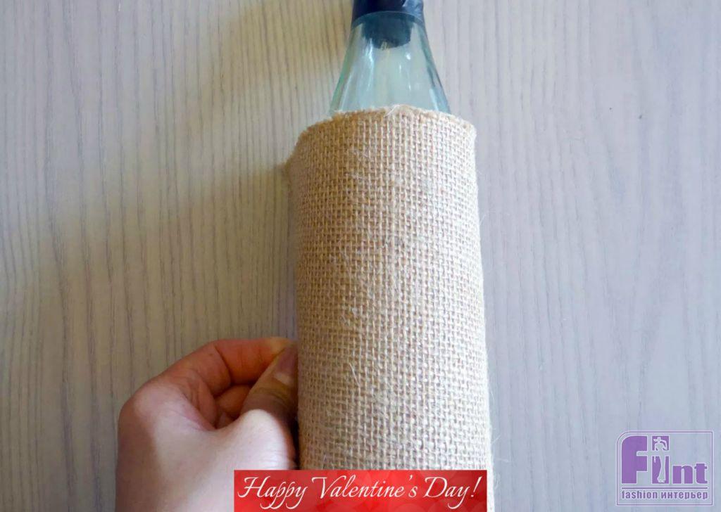 Используйте клеевой пистолет и закрепите мешковину так, чтобы сложенная в два слоя мешковина плотно прилегала к бутылке. Место сгиба должно находиться внизу, у дна бутылки. Верхняя часть мешковины с незакреплёнными нитками в месте отреза будет обращена к горлышку бутылки.