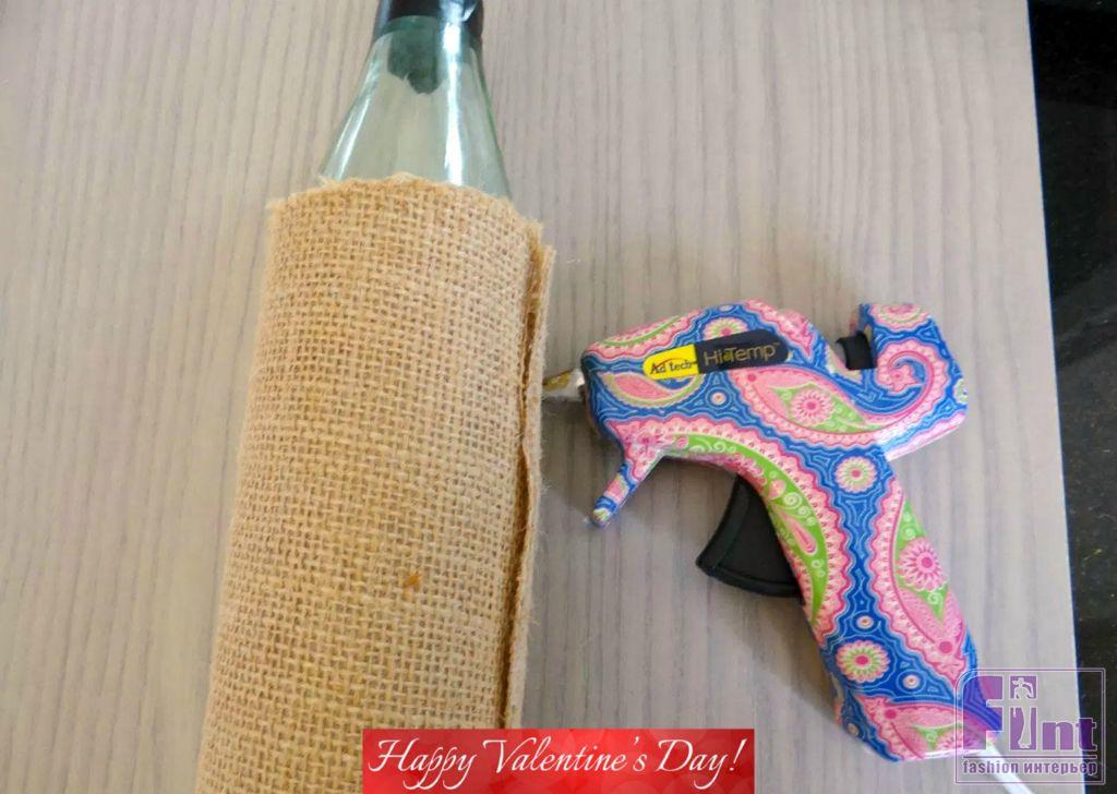 Готово! Осталось вставить в каждую бутылку по красивому пышному цветочку и прекрасное украшение для интерьера ко дню Святого Валентина, сделанное своими руками, может занять достойное место в интерьере вашего дома и порадовать любимого!
