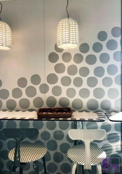 Для McDonald's Навоне придумала подчеркнуто винтажный интерьер в своей излюбленной бирюзово-коралловой гамме. Творческий почерк дизайнера прослеживается в декоре стен с графическими принтами, отсылающими к наскальной живописи, а также в плетёной мебели и плафонах, спроектированных Паолой специально для этого проекта.