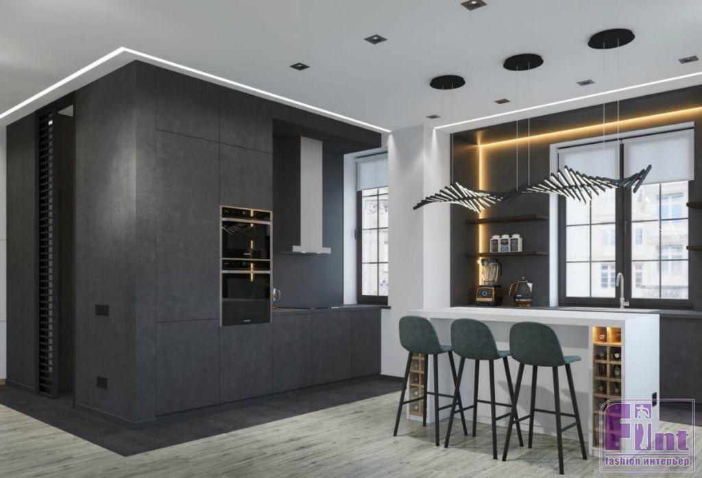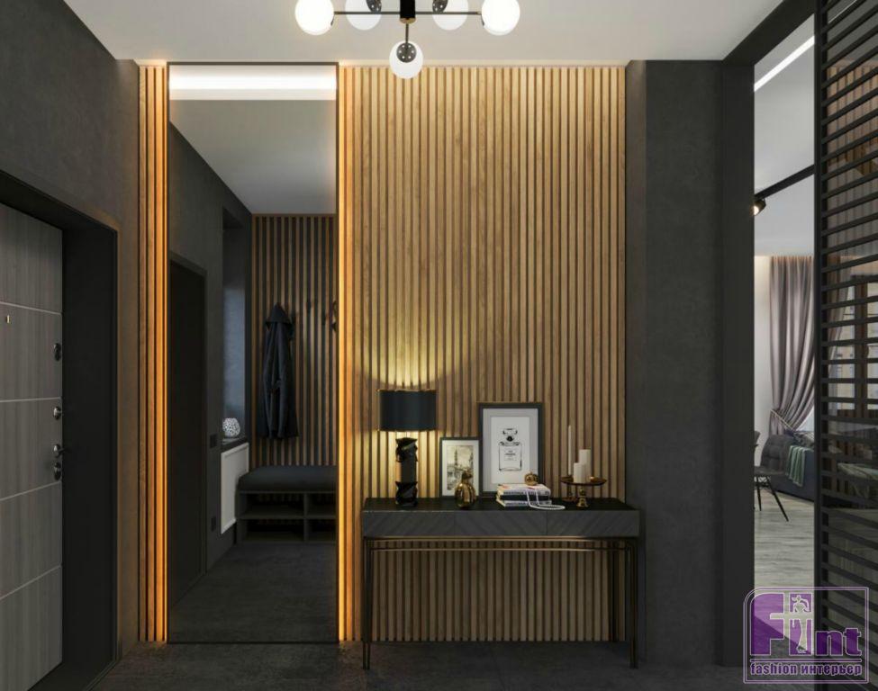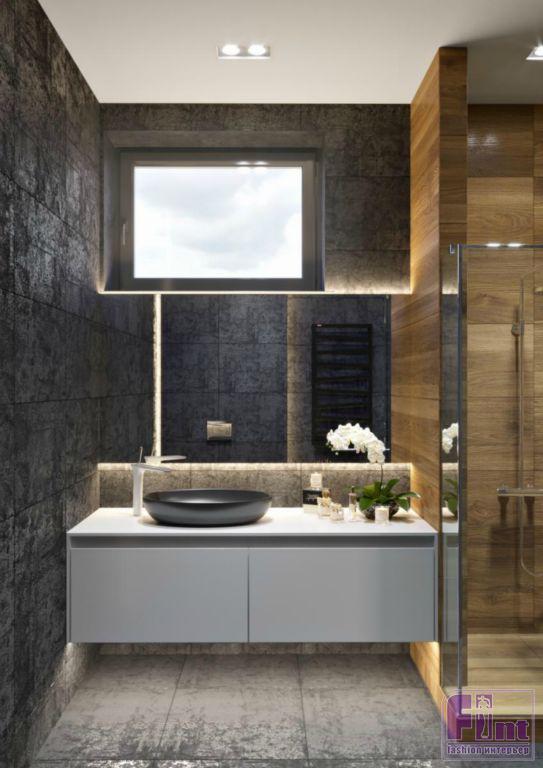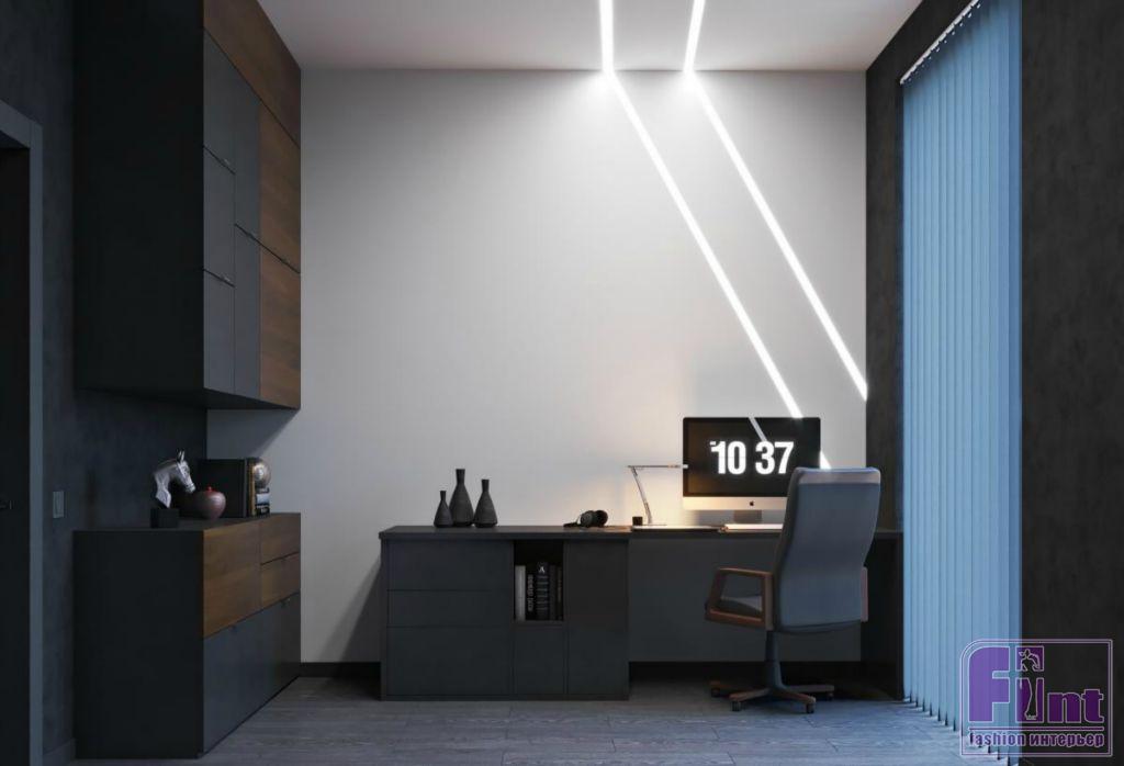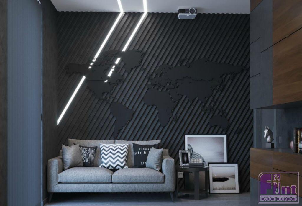 Впрочем, милый сердцу заказчика черный никуда не делся их интерьера: фактурные темные поверхности соседствуют с деревом, что придает им ещё большее благородство. Это сочетание древесного и тёмного цветов стало своеобразной «изюминкой» проекта. Из необычных решений — реечные конструкции на окнах «в пол», которые закрывают помещение от любопытных глаз, но не препятствуют естественному освещению жилого пространства. В конечном итоге получился облегчённый вариант лофта, констатирует автор проекта.