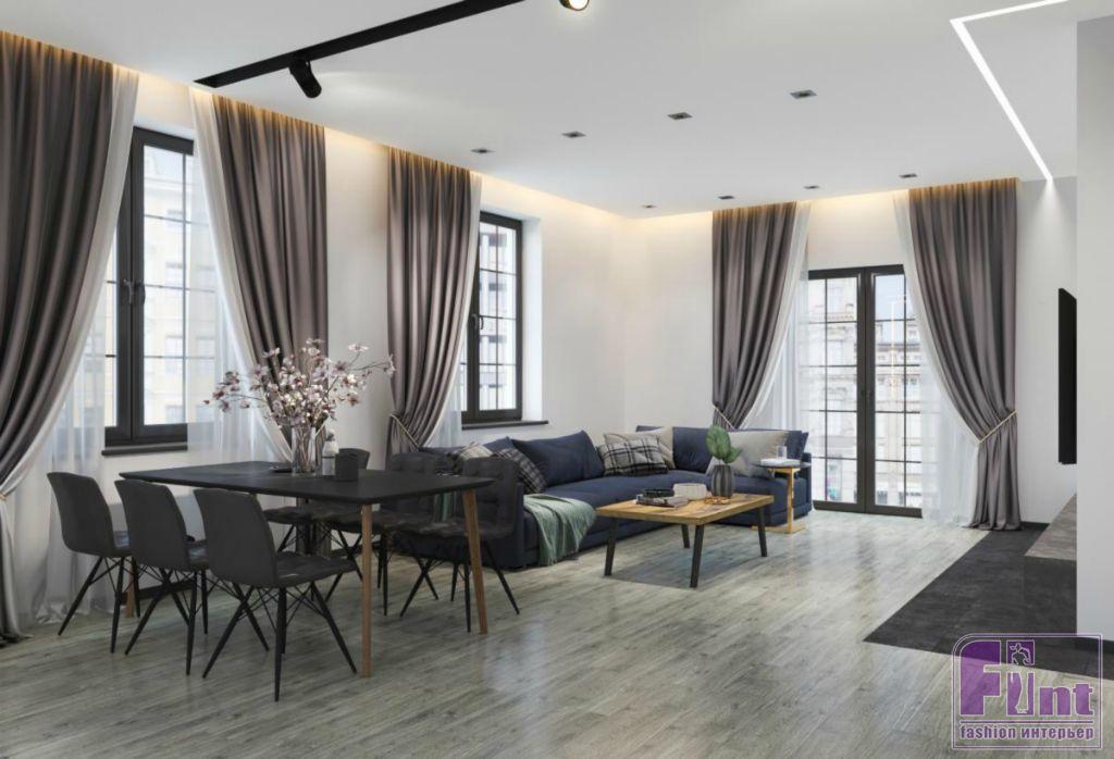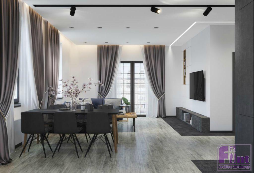 Гостиную и кухню дизайнеру удалось довольно логично объединить, создав пространство в светлых тонах. Тёмные нотки в объединённой зоне кухни и гостиной звучат в мебели и текстиле: по центру помещения дизайнер установила масштабный диван, а на окна подобрала подходящие по цвету и фактуре гардины. Также за тёмный акцент в помещении отвечает обеденный стол и стулья.