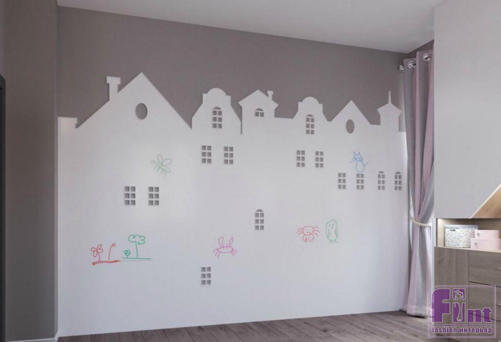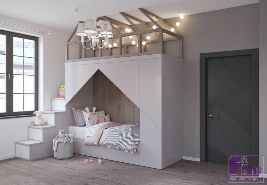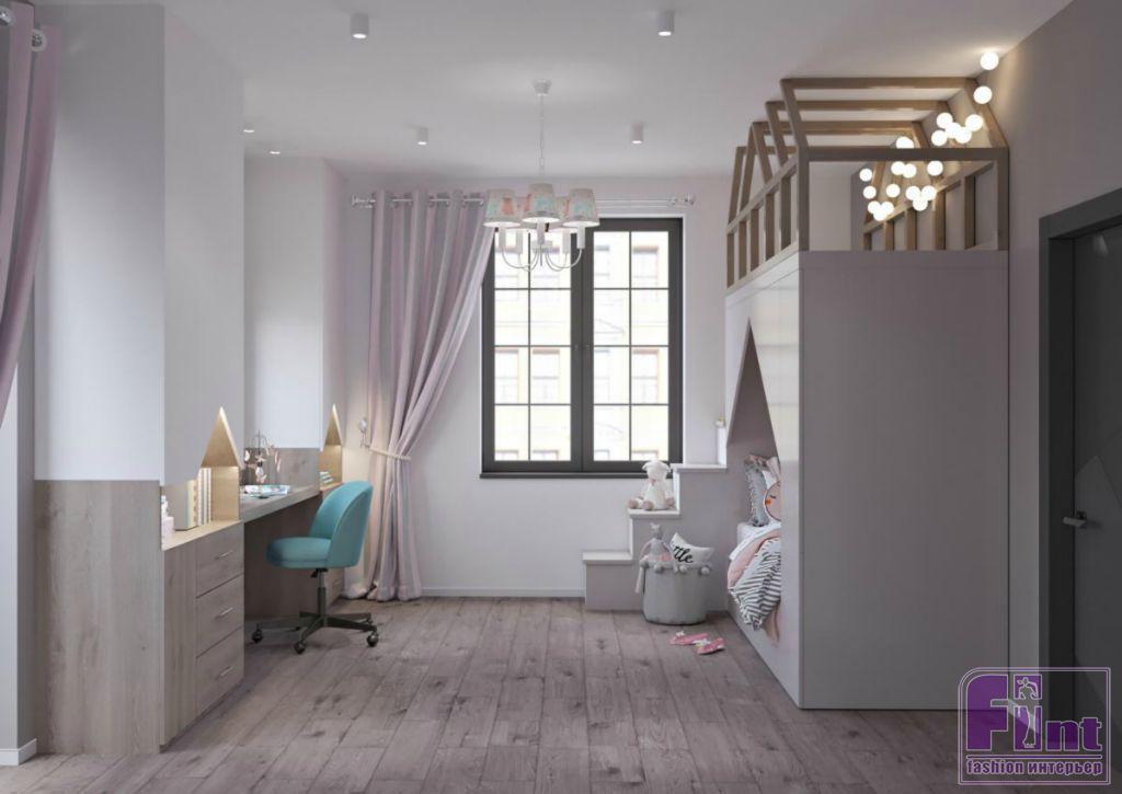 В детской комнате добавили нежных тонов, в результате чего получился очень лёгкий и уютный интерьер. В помещении детской обращает на себя внимание необычная конструкция кровати со вторым ярусом для игр и досуга. На этот своеобразный детский «чердачок» ведёт встроенная в конструкцию кровати лестница.