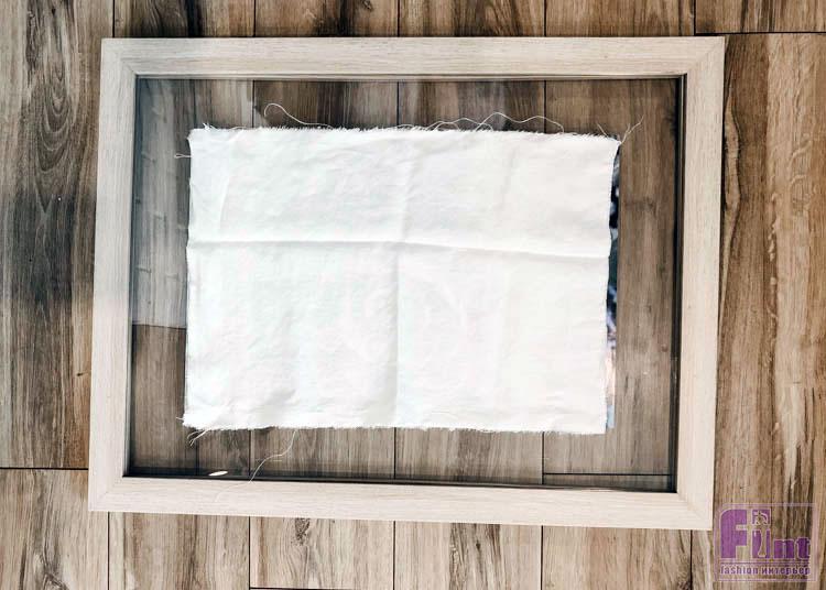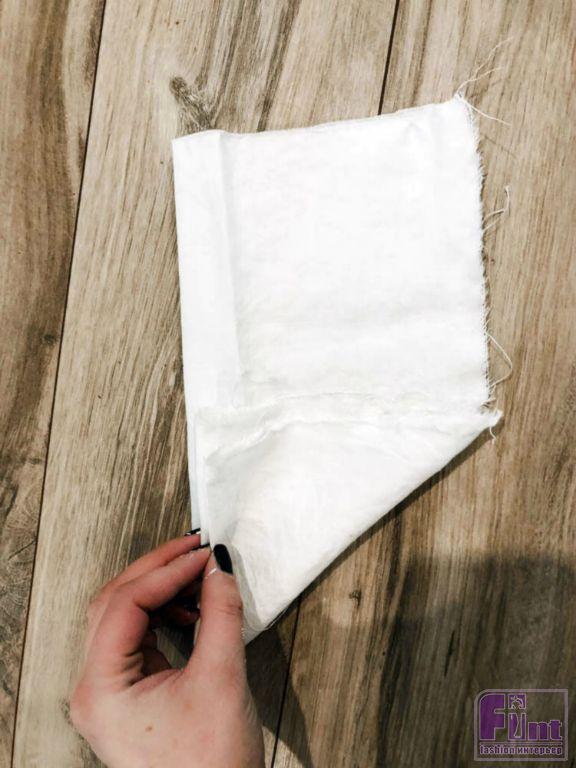 Первое, что нам необходимо сделать, это найти подходящую ткань. Мы использовали небольшой кусочек льняной ткани белого цвета, оставшийся от старой наволочки. Аккуратно обрываем ткань по размеру фоторамки, чтобы края изделия были неровными и напоминали старую, потёртую временем и частым использованием салфетку. Аккуратно порвать ткань довольно легко, поскольку она отлично рвётся в направлении плетения нитей.