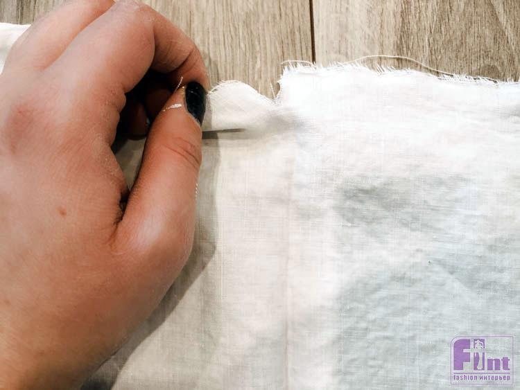 Первое, что нам необходимо сделать, это найти подходящую ткань. Мы использовали небольшой кусочек льняной ткани белого цвета, оставшийся от старой наволочки. Аккуратно обрываем ткань по размеру фоторамки, чтобы края изделия были неровными и напоминали старую, потёртую временем и частым использованием салфетку. Аккуратно порвать ткань довольно легко, поскольку она отлично рвётся в направлении плетения нитей.