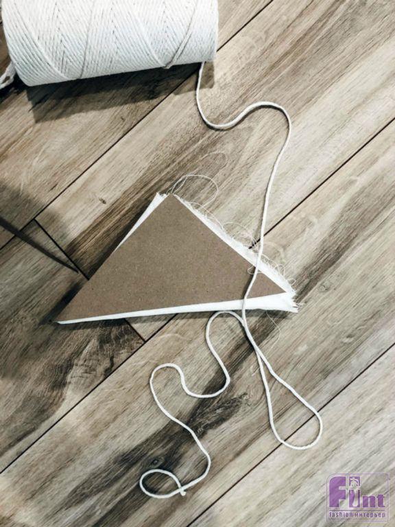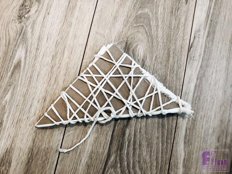 Закрепить нашу ткань для процесса окрашивания можно при помощи небольших картонок, вырезанных по размеру получившегося треугольника. Приложите треугольники из картона с двух сторон и закрепите конструкцию при помощи плотных ниток. Вместо ниток можно использовать обычные резинки, но они могут соскользнуть с заготовки, поэтому будьте внимательны.