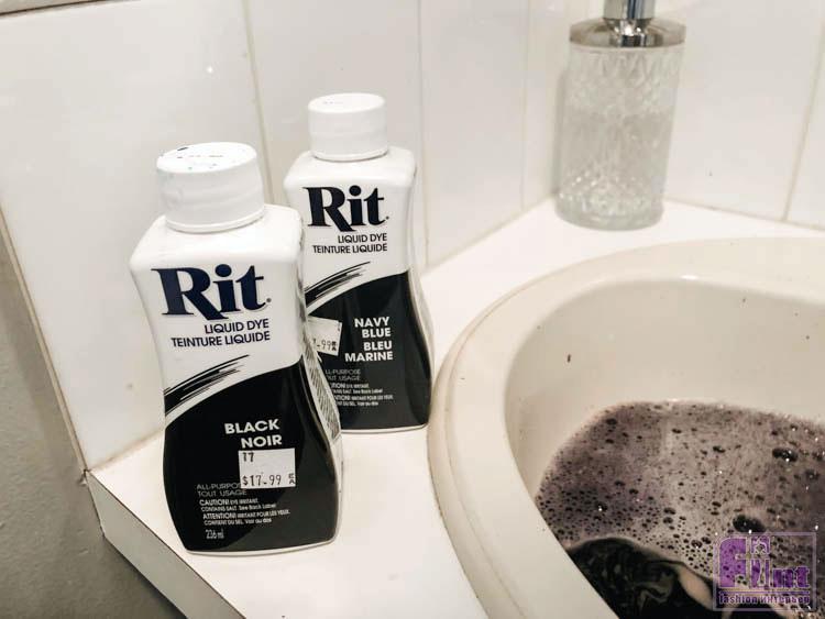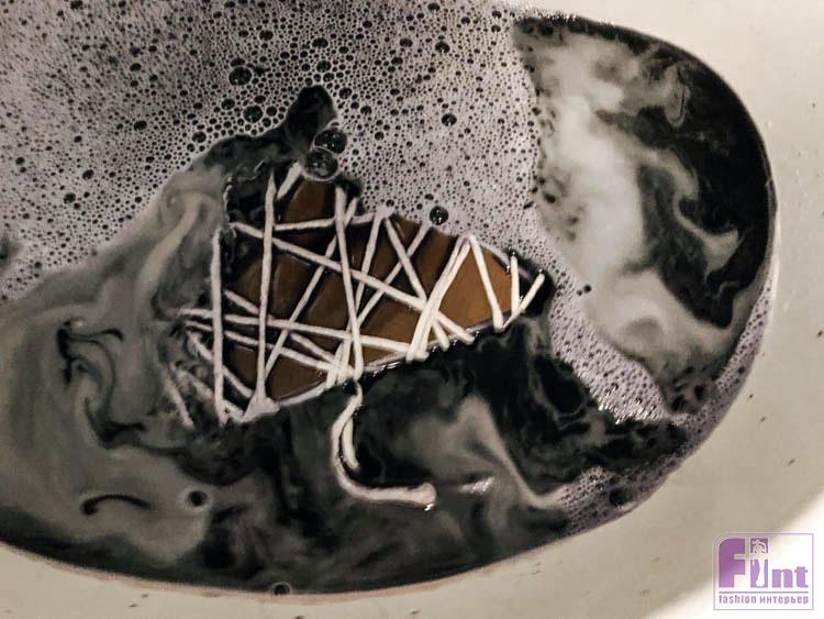 Теперь настала очередь красителя. Разведите его, как написано в инструкции. Мы использовали для проекта тёмно-синий и чёрный краситель, которые смешали в необходимых пропорциях для получения очень красивого пепельно-голубого оттенка. Перед окрашиванием нашу ткань, свёрнутую треугольниками, нужно замочить в чистой воде, которая должна пропитать ткань. В этом случае краситель будет лучше проникать в наш треугольный «сэндвич».