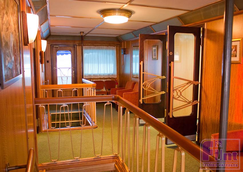 Мы находимся в диско-баре, оформленном в чёрно-серых тонах: стены, потолок и пол… простите, это же корабль, а значит — переборки, подволок и палуба. Мягкие кожаные диваны. Яркими акцентами здесь стали те самые дизайнерские подарки: жёлтые и оранжевые подушки, белоснежные ковры, светильники с разноцветными полосатыми абажурами, цветные коврики под барными стульями. Диско-бар получился очень современным и в то же время по-домашнему уютным. Здесь, на теплоходе, везде ощущаешь домашний уют. Особенно там, где обитают хозяева этого судна.