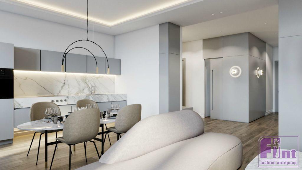 Схемы освещения играют в этом интерьере важную роль. В гостиной и коридоре верхний потолочный свет дополнен круглыми бра на стенах, а в зоне кухни в качестве потолочного светильника выступает дизайнерская люстра на длинном подвесе. По словам дизайнера, именно светильники вносят особую изюминку в это пространство.