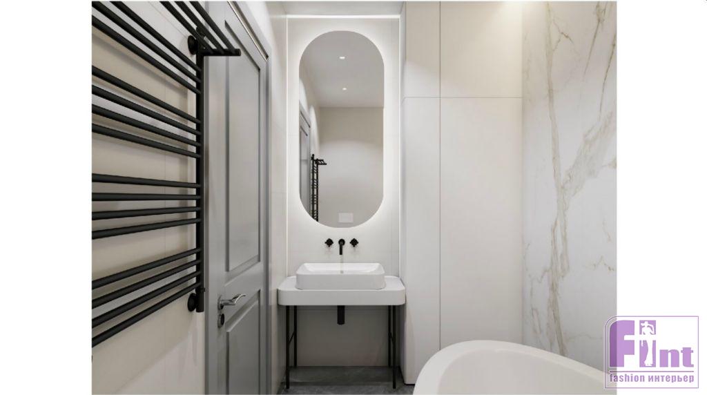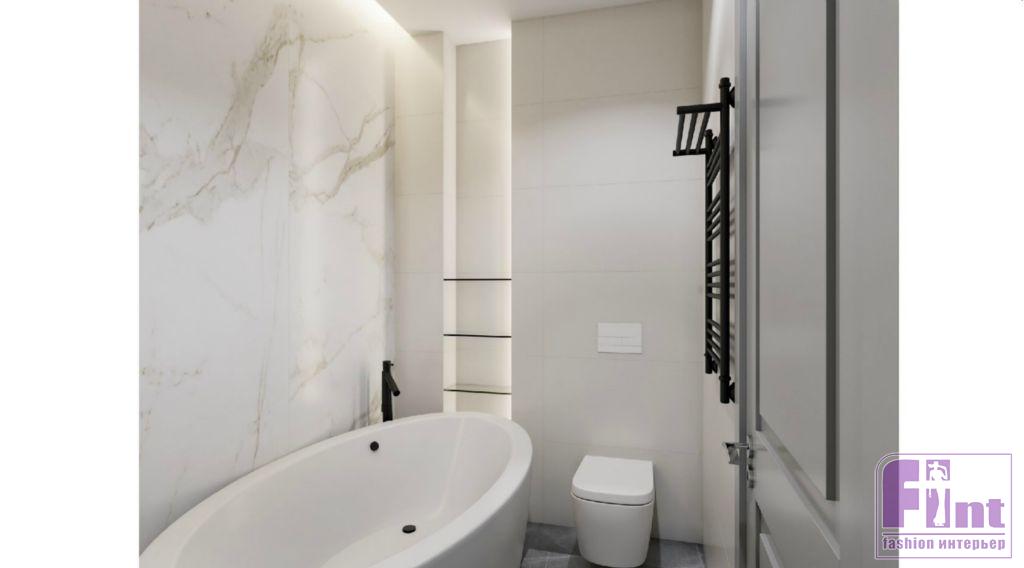 Предложенные решения — одно более тёмное, другое посветлее — должны были быть практичными, легко реализуемыми, с использованием качественных материалов. Так в интерьере появились дерево, мрамор и латунь. Особое место в интерьере занимает именно мрамор, плиты из которого были использованы в качестве кухонного фартука. Также мраморные панели дизайнер использовала при внутренней отделке ванной комнаты. Контраст с белым мрамором решён за счёт металлической фурнитуры смесителя и полотенцесушителя, выполненных в цвете состаренной античной латуни.