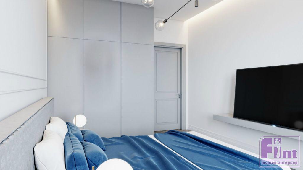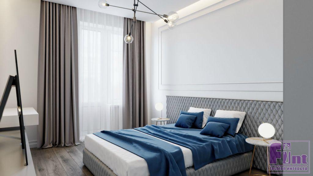 Изначально дизайнер разработала два типовых решения для интерьера: светлое и более тёмное. В спальне эти два решения объединились и используются одновременно. Нижняя част стен, отделанная каретной стяжкой, отвечает за более тёмный стиль помещения, в то время как верхняя часть стен формирует светлую цветовую гамму спальни.