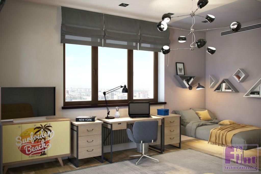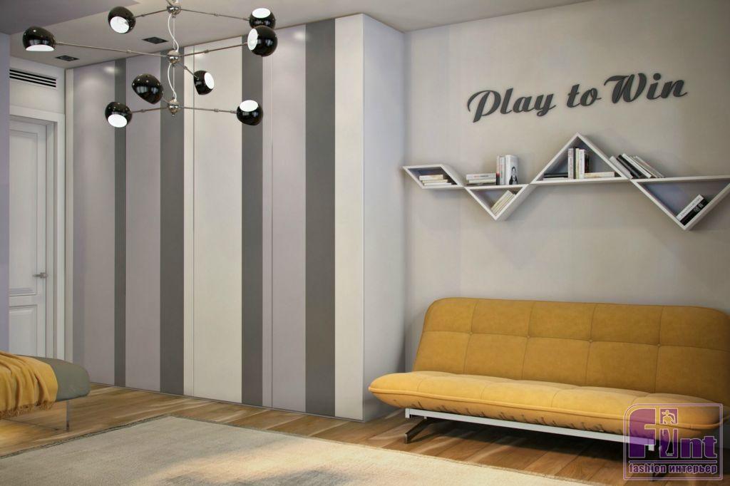 Для покрытия пола дизайнер предложила использовать паркетную доску очень деликатного оттенка, который выступает прекрасным фоном для мебели и текстильной обивки. Тема ЭКО стиля продолжается и в детской. Здесь цветовую гамму интерьера отлично дополняют текстильные элементы песочного цвета и небольшой, но вместительный комод с ярким принтом.
