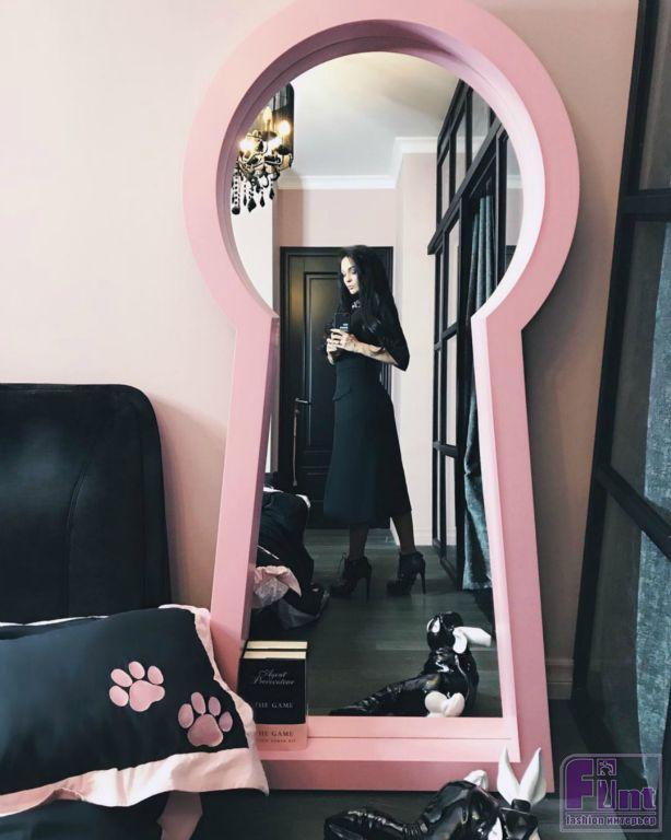 Спальня звезды оформлена в розово-чёрном цвете, это любимое цветовое сочетание Алёны. Здесь расположено оригинальное зеркало в виде замочной скважины и абажур ручной работы, который подарили родители.