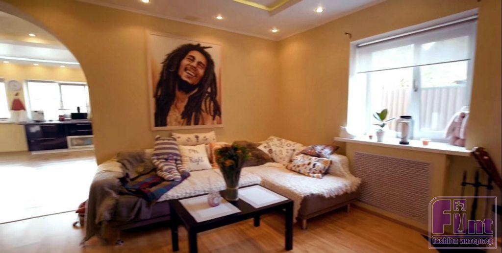 Следующая комната – просторная гостиная. В ней стоит уже новое пианино с удобным стулом. Певица любит в свободное время поиграть на инструменте и исполнить свои композиции «живьём» перед гостями. Так же в гостиной стоит раскладной угловой диван, на случай, если гости останутся с ночевкой, большая плазменная телевизионная панель с колонками домашнего кинотеатра и массивный угловой камин, возле которого певица любит коротать свободные вечера. На стене, как и в кухне, висит портрет Боба Марли, только уже гораздо большего размера, чем в зоне приёма пищи. На полу стоят большие горшки с живыми цветами. В углу примостился шкаф с большим количеством обуви певицы. На удивление, в этом шкафу преимущественно хранятся не красивые и элегантные концертные туфельки, а массивные сапоги и бутсы черного цвета!