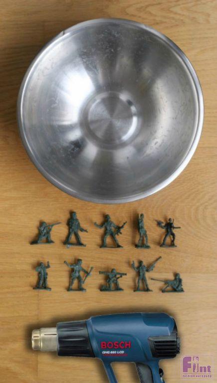 Используя строительный фен, начните нагревать конструкцию из солдатиков с расстояния 10-15 см от чаши, причём, поток горячего воздуха направляйте не внутрь чаши, а на её стенки – снаружи, чтобы солдатики не попадали от струи воздуха. Будьте осторожны и внимательны! Пары от плавящейся пластмассы могут быть очень токсичными! Не забудьте, что металлическая чаша очень сильно нагреется, поэтому используйте тряпку или варежку для духовки при вращении чаши.