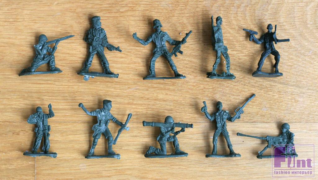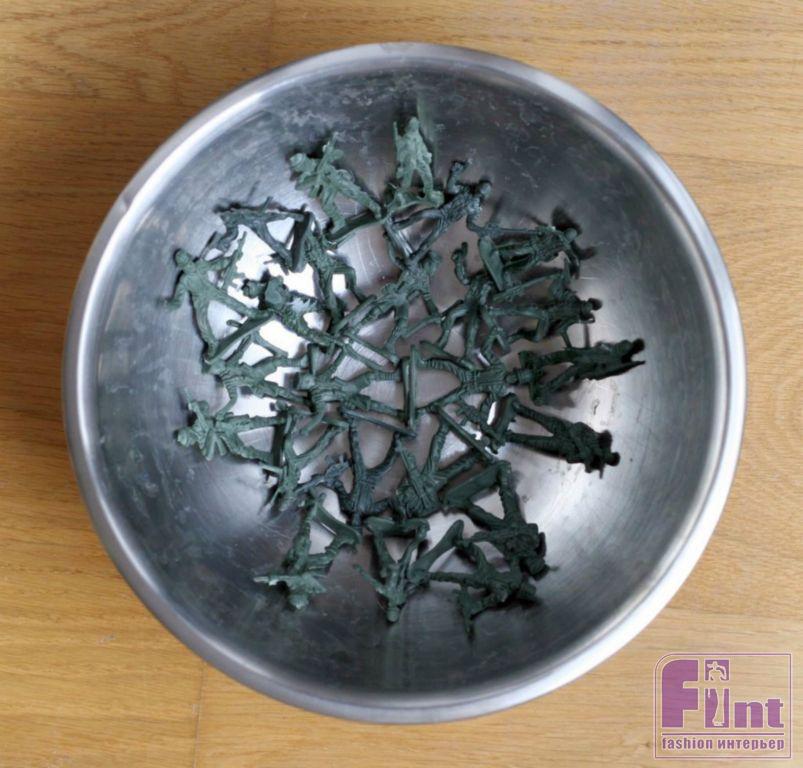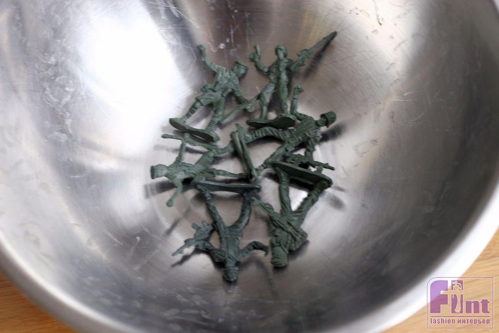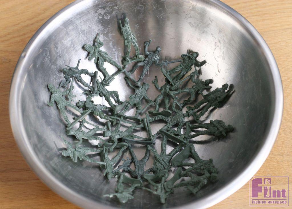Также вы можете использовать солдатиков из пластмассы другого цвета, допустим, красного. Или же смешать в одной вазе солдатиков двух или более цветов! Такое смешение родственных цветов позволит добиться на готовом изделии очень интересного декоративного эффекта перехода цвета.